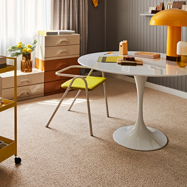 Grounding it all is Feltex’s Stonefields loop pile wool carpet in 16 Feldspar — a beautifully textured foundation that brings subtle depth and natural softness underfoot. The loop pile construction adds visual interest without overpowering the space, balancing bold colour with quiet sophistication.