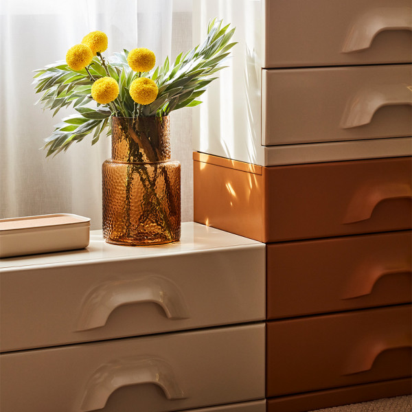 The narrative of thoughtful playfulness continues in this vibrant study, where blue-grey panelled walls offer a calm, composed backdrop for expressive design moments. Vintage orange and cream cabinetry introduces a nostalgic warmth, while a sleek white chair, upholstered in lively chartreuse, strikes a crisp, modern note. A yellow rolling tray table adds functionality with flair, and a warm mandarin dome lamp casts a soft, energising glow — the perfect finishing touch in a room designed to inspire.