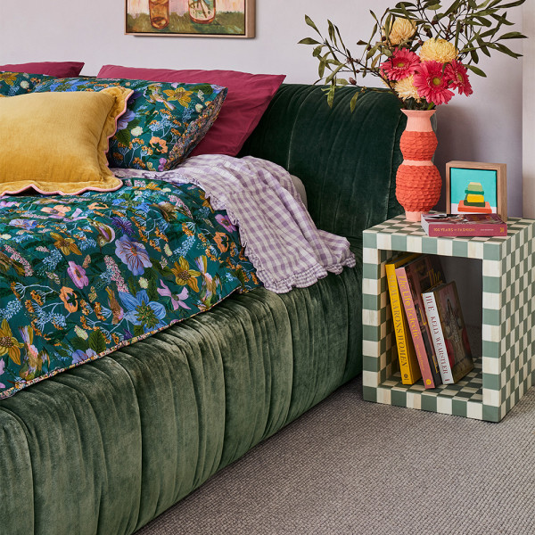 The bold essence of maximalist interior design is celebrated in this captivating bedroom, blending vibrant colours, eclectic patterns, and luxurious textures into a harmonious and inviting space. The foundation of the room is the wool carpet Chelsea Row in colour 710 Westminster, whose soft, neutral tone provides the perfect backdrop for the explosion of colours and patterns that define the space. The plush green velvet bed makes a striking statement, draped with a vibrant floral quilt that features a medley of intricate patterns and complemented by a variety of pillows in bold hues like mustard yellow, dusty pink, and burnt orange. This layering of textures and colours is a hallmark of maximalism, creating a space that feels both rich and dynamic.
