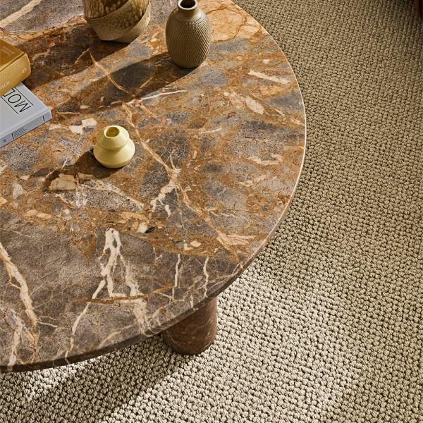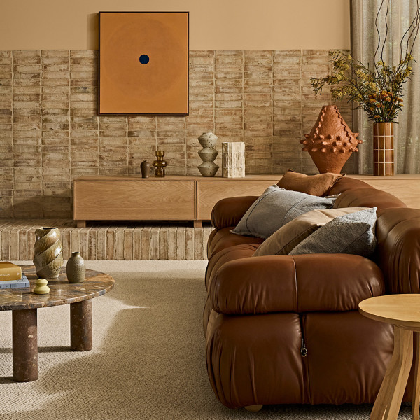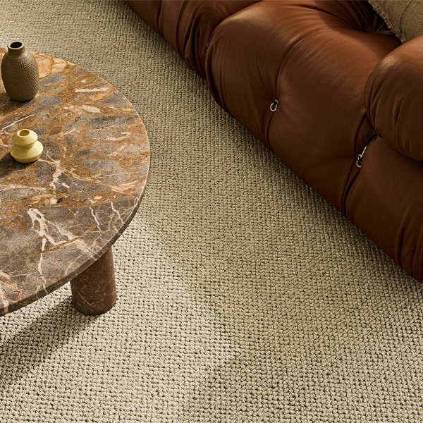 Anchoring the space is Stonefields wool carpet in 1 Cotswold Stone. Its cream-beige loop pile texture balances the bolder elements above, softening the overall scheme and reinforcing the value of wool carpet in creating refined, tactile and inviting interiors.