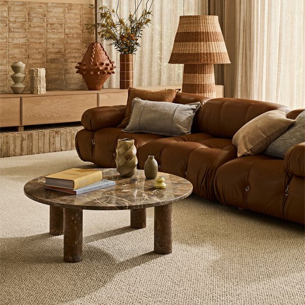 At the centre of the room, a marbled coffee table features caramel veining with subtle blue undertones, which are echoed through carefully chosen styling accents for cohesion. A woven striped floor lamp adds rhythm and visual interest, bringing softness and dimension through pattern and texture.