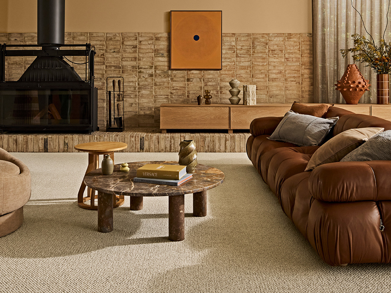 This living room is defined by a rich, layered approach to colour and material, using warm mandarin, mustard and butter-yellow tones to create a welcoming, immersive atmosphere.