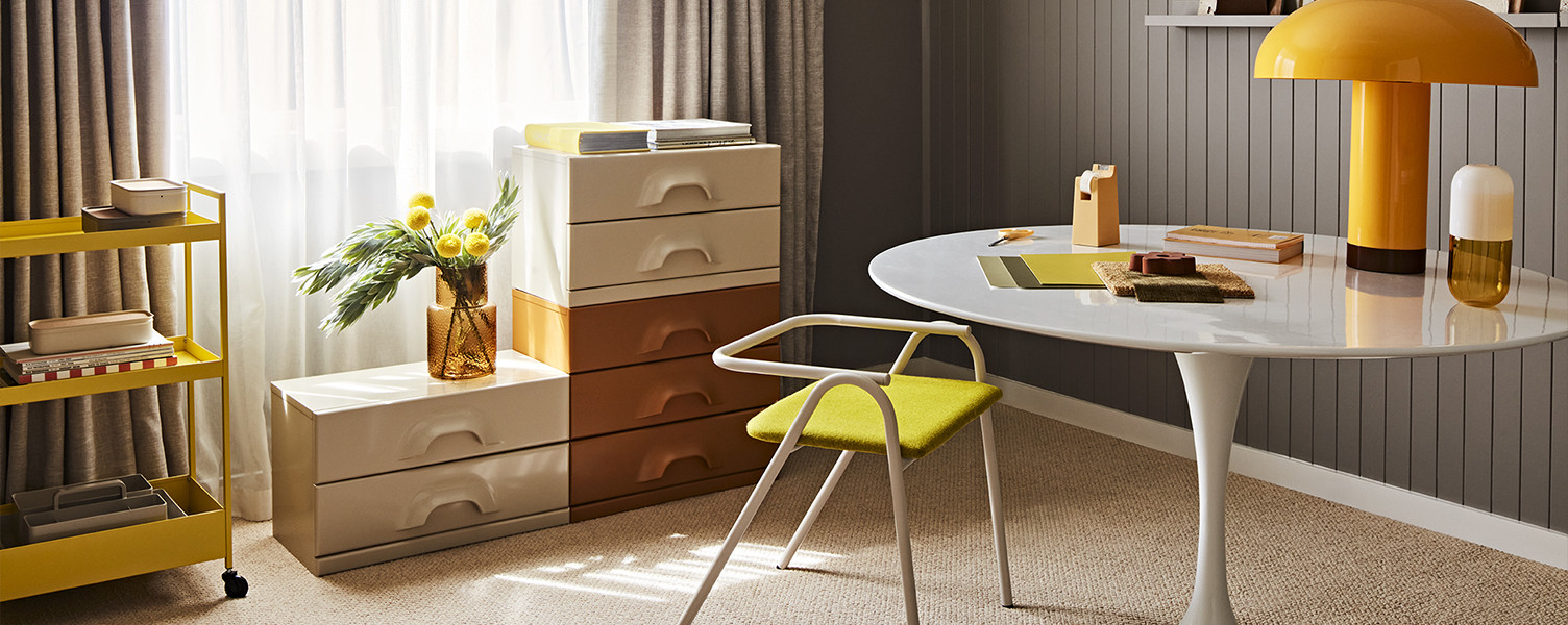 The Vivid Expression palette begins with a clear protagonist: sunflower yellow. Joyful and radiant, this shade sets a spirited tone, complemented by a supporting cast of sun-warmed hues and fresh botanicals—blond oak, biscuit beige, sunbaked terracotta, sage, emerald green, and the on-trend chartreuse, a key colour emerging in both fashion and interiors.